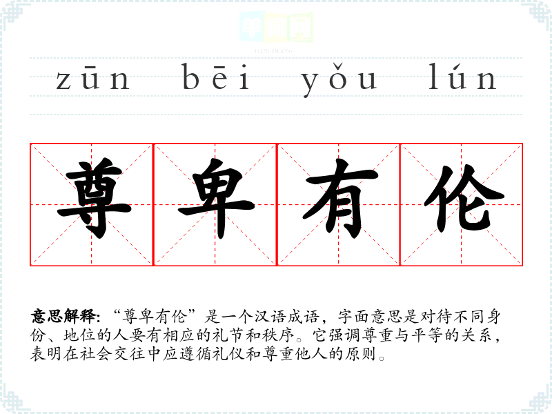 “尊卑有伦”是一个汉语成语,字面意思是对待不同身份、地位的人要有相应的礼节和秩序。它强调尊重与平等的关系,表明在社会交往中应遵循礼仪和尊重他人的原则。