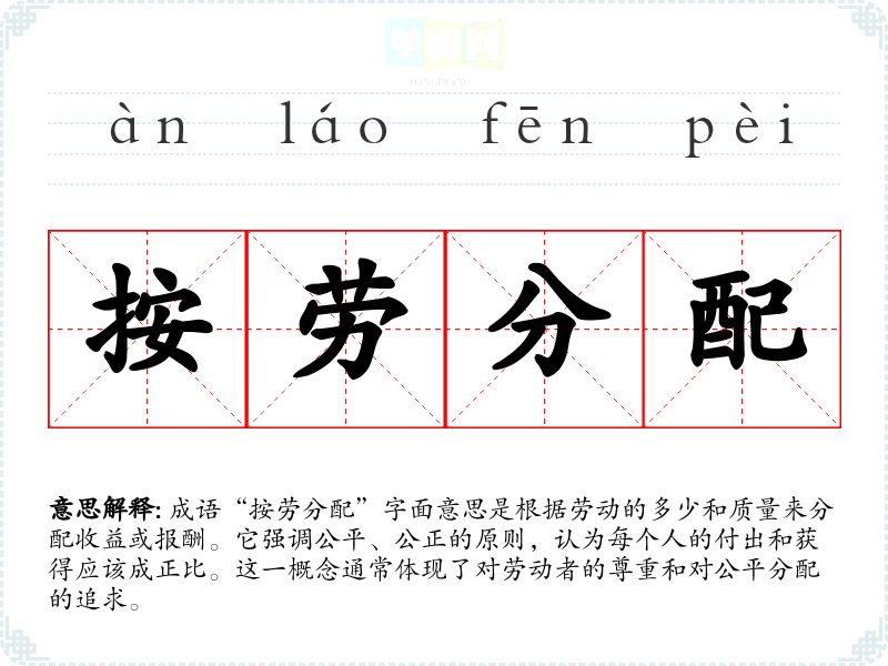 成语“按劳分配”字面意思是根据劳动的多少和质量来分配收益或报酬。它强调公平、公正的原则,认为每个人的付出和获得应该成正比。这一概念通常体现了对劳动者的尊重和对公平分配的追求。
