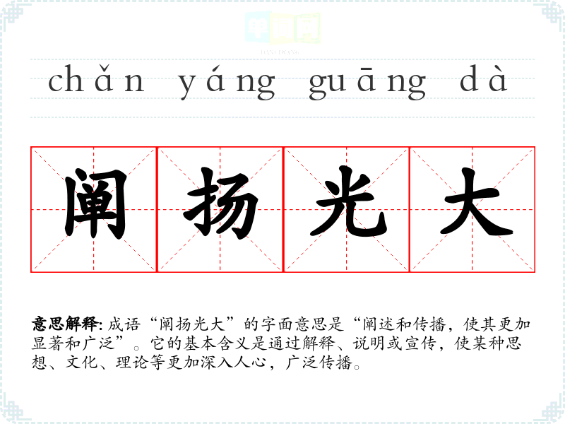 | 阐扬光大 | 发扬光大。指使美好的事物在原来基础上不断发展、扩大和提高。 |