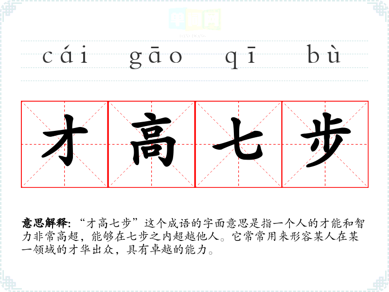 “才高七步”这个成语的字面意思是指一个人的才能和智力非常高超,能够在七步之内超越他人。它常常用来形容某人在某一领域的才华出众,具有卓越的能力。