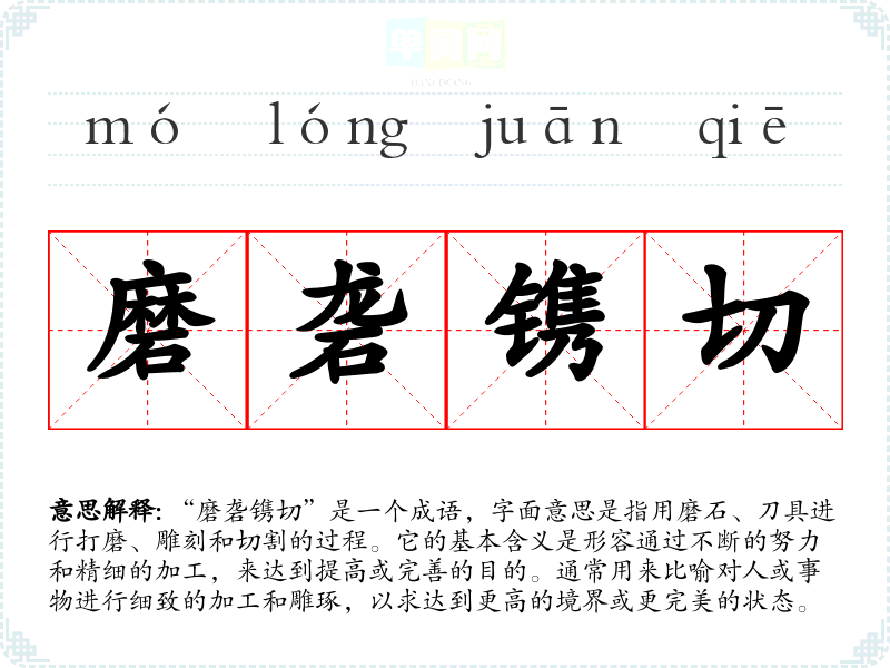 “磨砻镌切”是一个成语,字面意思是指用磨石、刀具进行打磨、雕刻和切割的过程。它的基本含义是形容通过不断的努力和精细的加工,来达到提高或完善的目的。通常用来比喻对人或事物进行细致的加工和雕琢,以求达到更高的境界或更完美的状态。