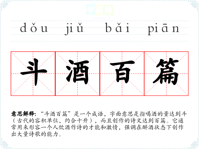 “斗酒百篇”出自唐代诗人李白的《将进酒》。李白以豪放的个性和高超的诗才而闻名,常常在饮酒中激发灵感,创作出许多脍炙人口的诗篇。这一成语体现了李白那种豪饮酒、作诗成性的风格,反映了他对酒与诗的热爱。
