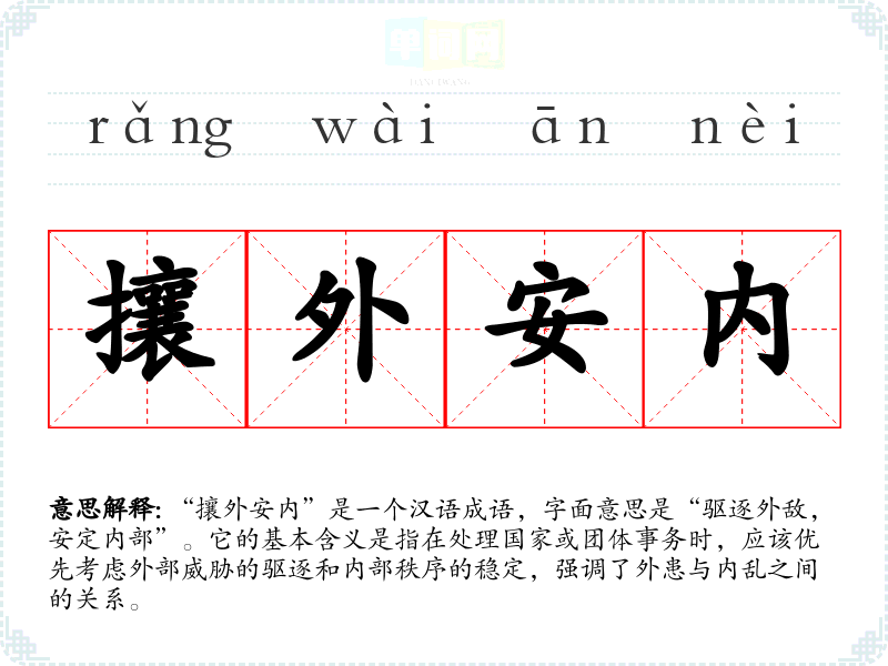 - 同义成语:安内攘外(强调内部安定同样重要)。