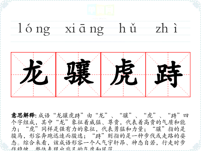 成语“龙骧虎跱”由“龙”、“骧”、“虎”、“跱”四个字组成,其中“龙”象征着威猛、尊贵,代表着高贵的气质和能力;“虎”同样是强有力的象征,代表勇猛和力量;“骧”指的是骏马,形容奔跑迅速而骏逸;“跱”则指的是一种步伐或走路的姿态。综合来看,该成语形容一个人气宇轩昂、神态自若,行走时步伐稳健,整体表现出非凡的气度和风范。