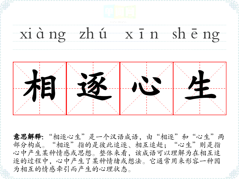 “相逐心生”的具体历史来源并不明确,可能并没有直接的典故或文学出处。在汉语成语中,很多成语是通过古代文人创作的诗词、散文或其他文献逐渐流传而来的。这个成语的构成元素在古代文学中有广泛的出现,尤其是在描写情感和人际关系的作品中。
