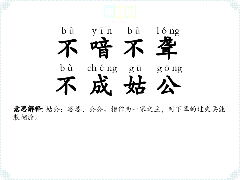 | 不喑不聋,不成姑公 | 姑公:婆婆,公公。指作为一家之主,对下辈的过失要能装糊涂。 |