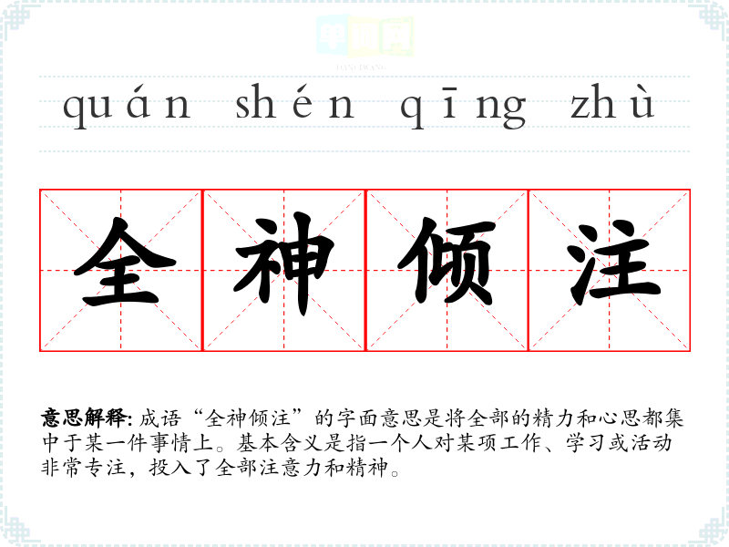 “全神倾注”源于古代文人对专注和用心的重视,表达了在做事情时需要全力以赴的态度。虽然没有具体的历史典故,但它与**传统文化中强调的“专心致志”的理念密切相关,体现了对精神集中和努力追求的赞美。