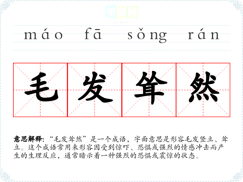“毛发耸然”是一个成语,字面意思是形容毛发竖立、耸立。这个成语常用来形容因受到惊吓、恐惧或强烈的情感冲击而产生的生理反应,通常暗示着一种强烈的恐惧或震惊的状态。
