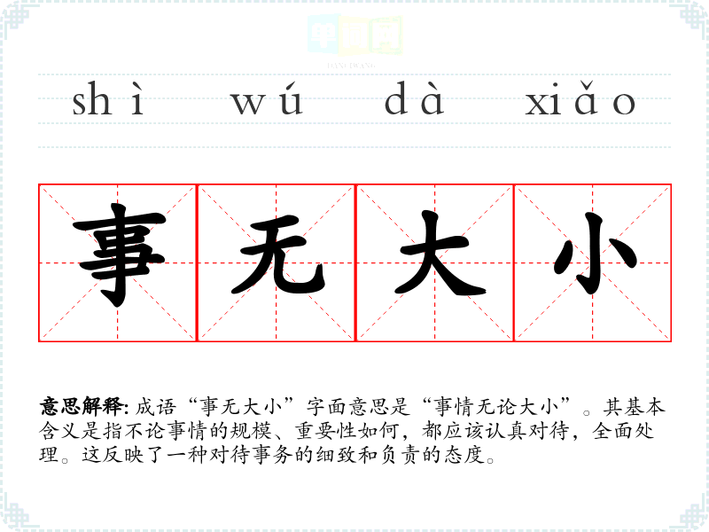 成语“事无大小”字面意思是“事情无论大小”。其基本含义是指不论事情的规模、重要性如何,都应该认真对待,全面处理。这反映了一种对待事务的细致和负责的态度。