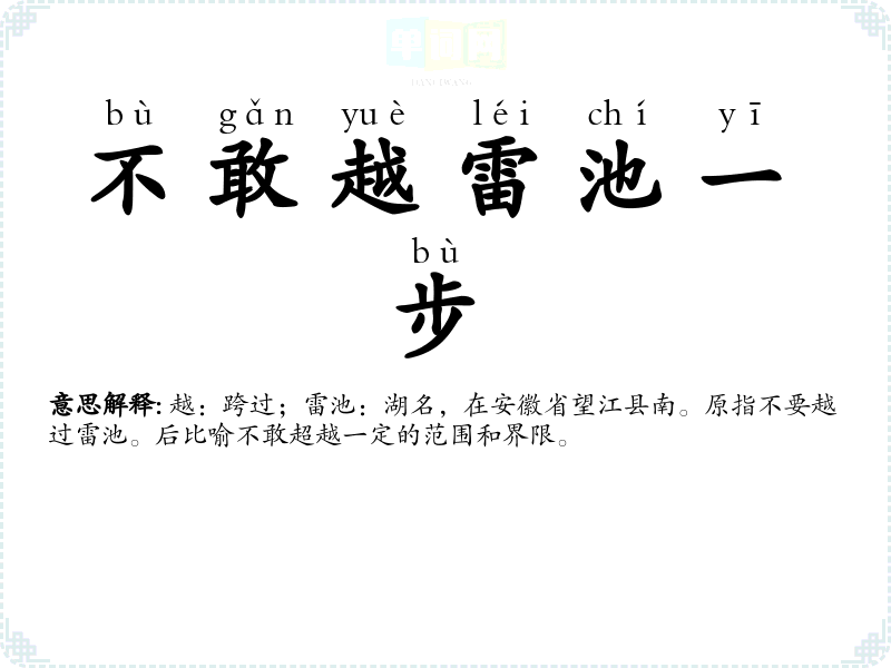 | 不敢越雷池一步 | 越:跨过;雷池:湖名,在安徽省望江县南。原指不要越过雷池。后比喻不敢超越一定的范围和界限。 |