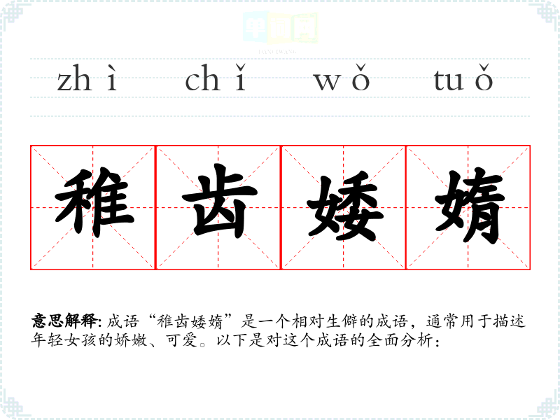 成语“稚齿婑媠”是一个相对生僻的成语,通常用于描述年轻女孩的娇嫩、可爱。以下是对这个成语的全面分析: