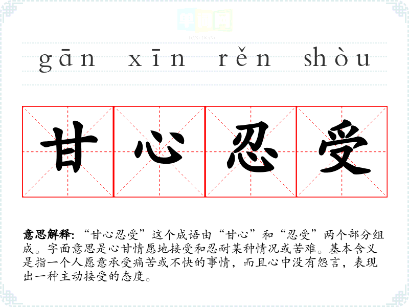 在我自己的生活中,我曾经历过一段困难时期,工作压力巨大,但我选择了“甘心忍受”,努力调整自己的心态,最终克服了那些挑战。这种经历让我更加理解了这个成语的含义,也使我在面对未来的困难时更加从容。