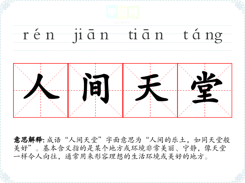成语“人间天堂”字面意思为“人间的乐土,如同天堂般美好”。基本含义指的是某个地方或环境非常美丽、宁静,像天堂一样令人向往,通常用来形容理想的生活环境或美好的地方。