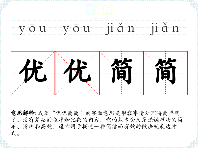 成语“优优简简”的字面意思是形容事情处理得简单明了,没有复杂的程序和冗杂的内容。它的基本含义是强调事物的简单、清晰和高效,通常用于描述一种简洁而有效的做法或表达方式。