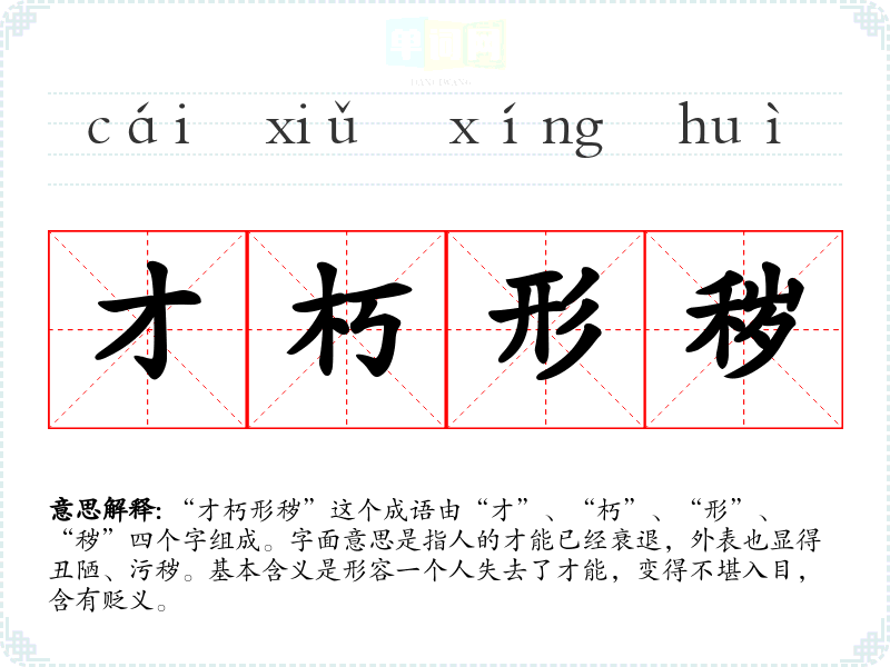 “才朽形秽”这个成语由“才”、“朽”、“形”、“秽”四个字组成。字面意思是指人的才能已经衰退,外表也显得丑陋、污秽。基本含义是形容一个人失去了才能,变得不堪入目,含有贬义。