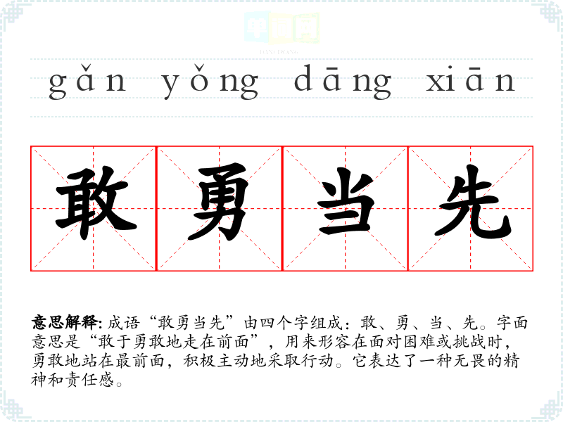 成语“敢勇当先”由四个字组成:敢、勇、当、先。字面意思是“敢于勇敢地走在前面”,用来形容在面对困难或挑战时,勇敢地站在最前面,积极主动地采取行动。它表达了一种无畏的精神和责任感。