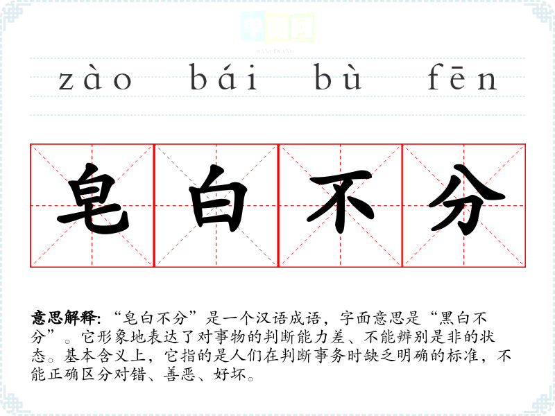 | 皂白不分 | 不分黑白,不分是非。 |