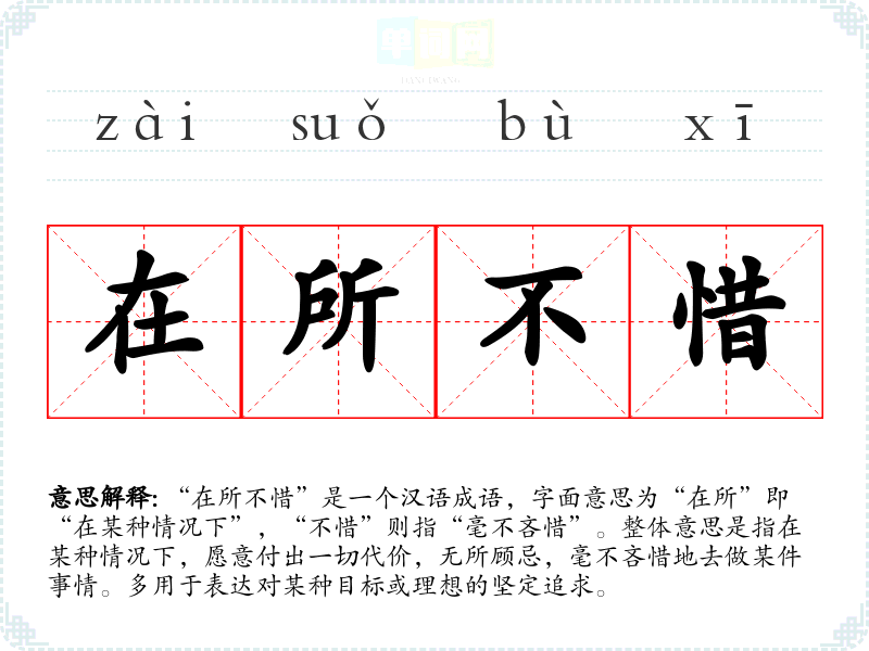 “在所不惜”是一个汉语成语,字面意思为“在所”即“在某种情况下”,“不惜”则指“毫不吝惜”。整体意思是指在某种情况下,愿意付出一切代价,无所顾忌,毫不吝惜地去做某件事情。多用于表达对某种目标或理想的坚定追求。