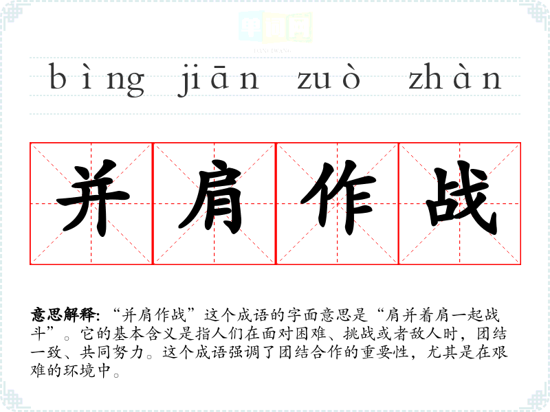 “并肩作战”这个成语的字面意思是“肩并着肩一起战斗”。它的基本含义是指人们在面对困难、挑战或者敌人时,团结一致、共同努力。这个成语强调了团结合作的重要性,尤其是在艰难的环境中。