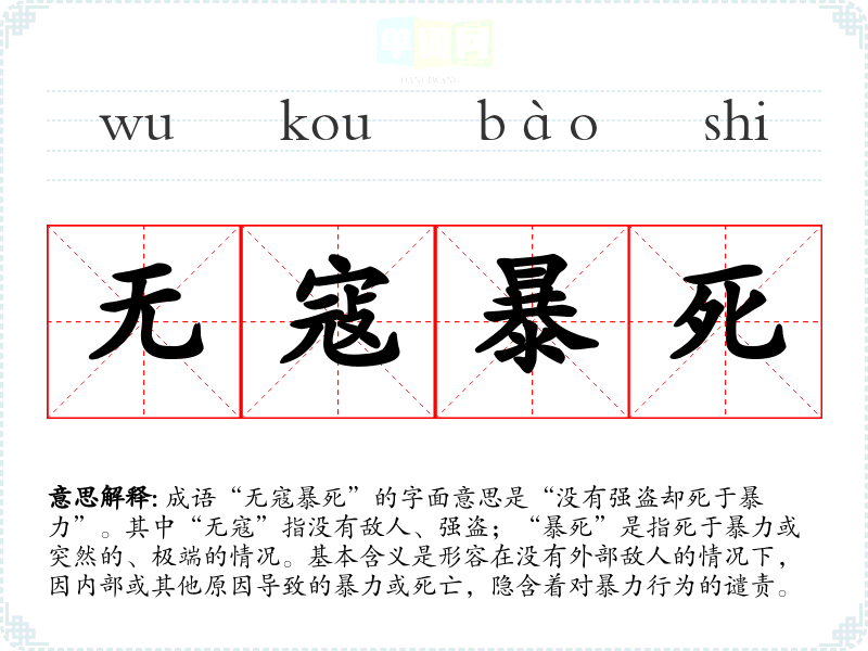 成语“无寇暴死”的字面意思是“没有强盗却死于暴力”。其中“无寇”指没有敌人、强盗;“暴死”是指死于暴力或突然的、极端的情况。基本含义是形容在没有外部敌人的情况下,因内部或其他原因导致的暴力或死亡,隐含着对暴力行为的谴责。
