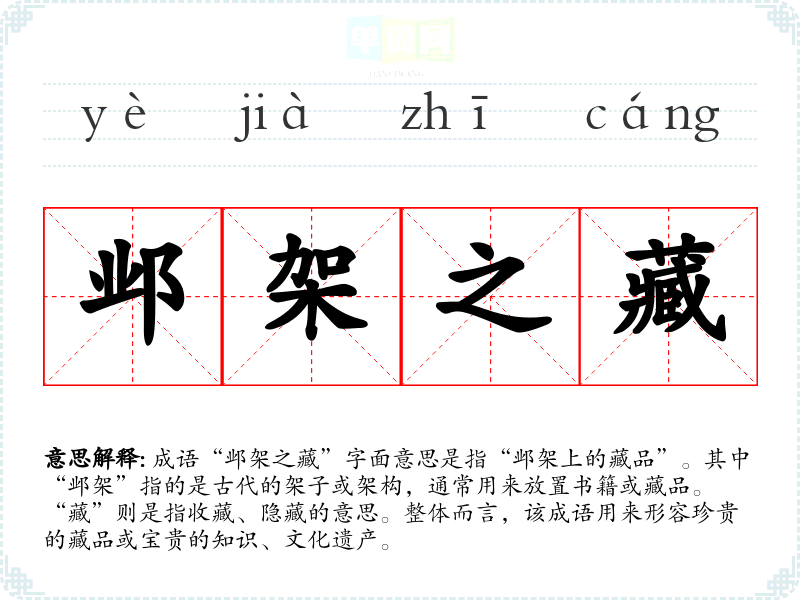 “邺架之藏”让我联想到对文化的尊重和对历史的敬畏。在现代生活中,许多人可能对传统文化的理解不够深刻,而这个成语则提醒我们去探索和珍惜那些丰富的文化遗产。