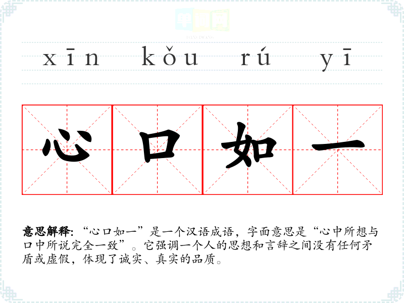 “心口如一”是一个汉语成语,字面意思是“心中所想与口中所说完全一致”。它强调一个人的思想和言辞之间没有任何矛盾或虚假,体现了诚实、真实的品质。