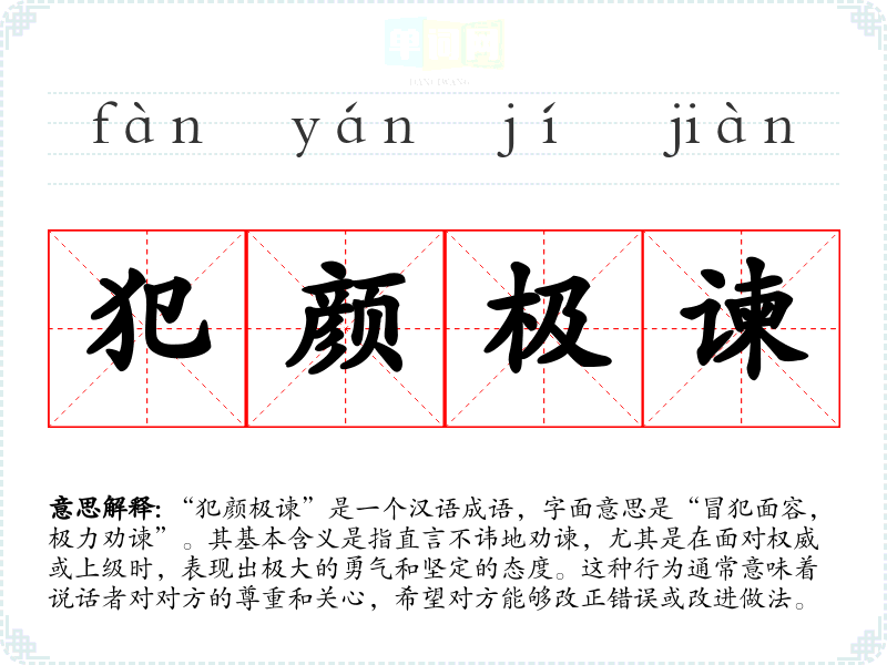 “犯颜极谏”是一个汉语成语,字面意思是“冒犯面容,极力劝谏”。其基本含义是指直言不讳地劝谏,尤其是在面对权威或上级时,表现出极大的勇气和坚定的态度。这种行为通常意味着说话者对对方的尊重和关心,希望对方能够改正错误或改进做法。