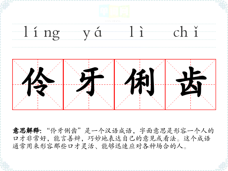 “伶牙俐齿”是一个汉语成语,字面意思是形容一个人的口才非常好,能言善辩,巧妙地表达自己的意见或看法。这个成语通常用来形容那些口才灵活、能够迅速应对各种场合的人。