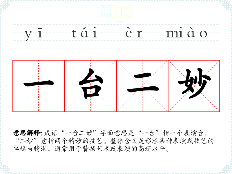 成语“一台二妙”字面意思是“一台”指一个表演台,“二妙”意指两个精妙的技艺。整体含义是形容某种表演或技艺的卓越与精湛,通常用于赞扬艺术或表演的高超水平。