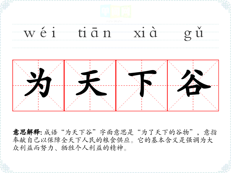 成语“为天下谷”字面意思是“为了天下的谷物”,意指奉献自己以保障全天下人民的粮食供应。它的基本含义是强调为大众利益而努力、牺牲个人利益的精神。