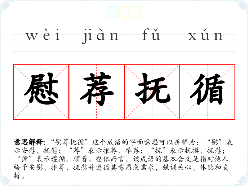 “慰荐抚循”这个成语的字面意思可以拆解为:“慰”表示安慰、抚慰;“荐”表示推荐、举荐;“抚”表示抚摸、抚慰;“循”表示遵循、顺着。整体而言,该成语的基本含义是指对他人给予安慰、推荐、抚慰并遵循其意愿或需求,强调关心、体贴和支持。