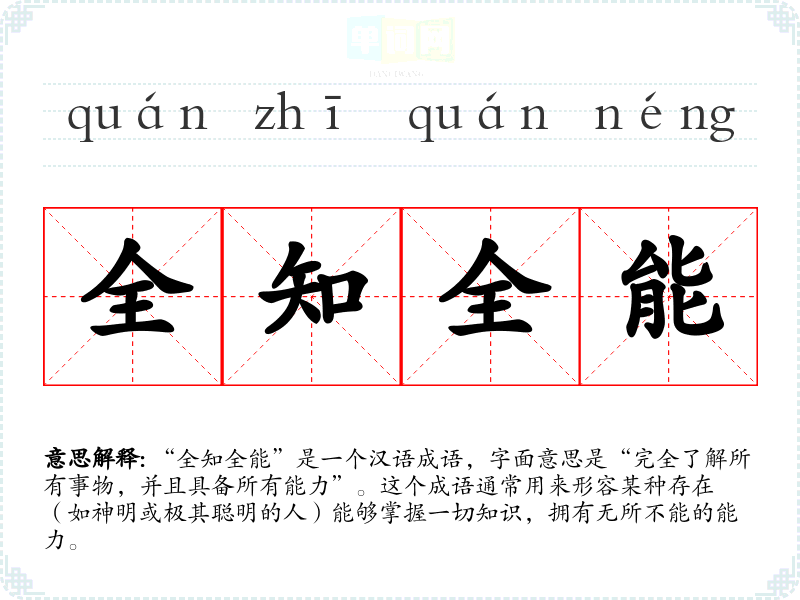 “全知全能”是一个汉语成语,字面意思是“完全了解所有事物,并且具备所有能力”。这个成语通常用来形容某种存在(如神明或极其聪明的人)能够掌握一切知识,拥有无所不能的能力。