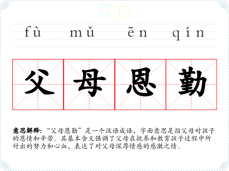 “父母恩勤”是一个汉语成语,字面意思是指父母对孩子的恩情和辛劳。其基本含义强调了父母在抚养和教育孩子过程中所付出的努力和心血,表达了对父母深厚情感的感激之情。