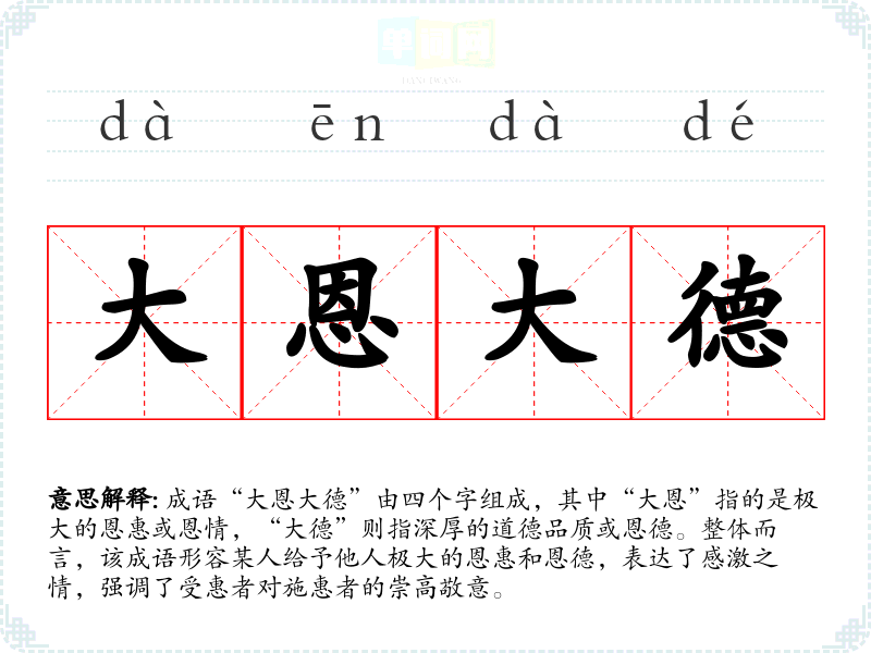 成语“大恩大德”由四个字组成,其中“大恩”指的是极大的恩惠或恩情,“大德”则指深厚的道德品质或恩德。整体而言,该成语形容某人给予他人极大的恩惠和恩德,表达了感激之情,强调了受惠者对施惠者的崇高敬意。