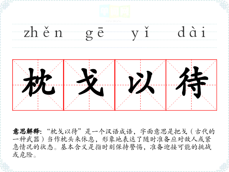 “枕戈以待”是一个汉语成语,字面意思是把戈(古代的一种武器)当作枕头来休息,形象地表达了随时准备应对敌人或紧急情况的状态。基本含义是指时刻保持警惕,准备迎接可能的挑战或危险。