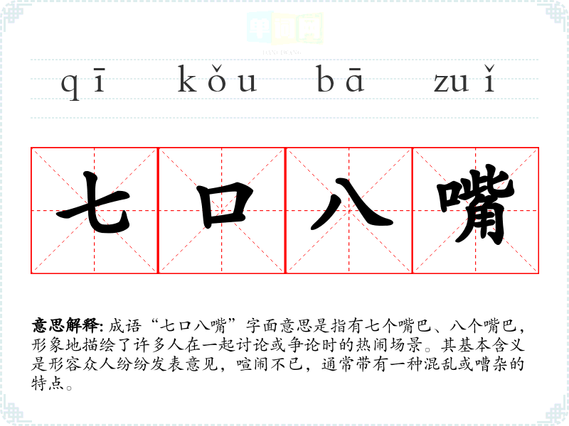 成语“七口八嘴”字面意思是指有七个嘴巴、八个嘴巴,形象地描绘了许多人在一起讨论或争论时的热闹场景。其基本含义是形容众人纷纷发表意见,喧闹不已,通常带有一种混乱或嘈杂的特点。