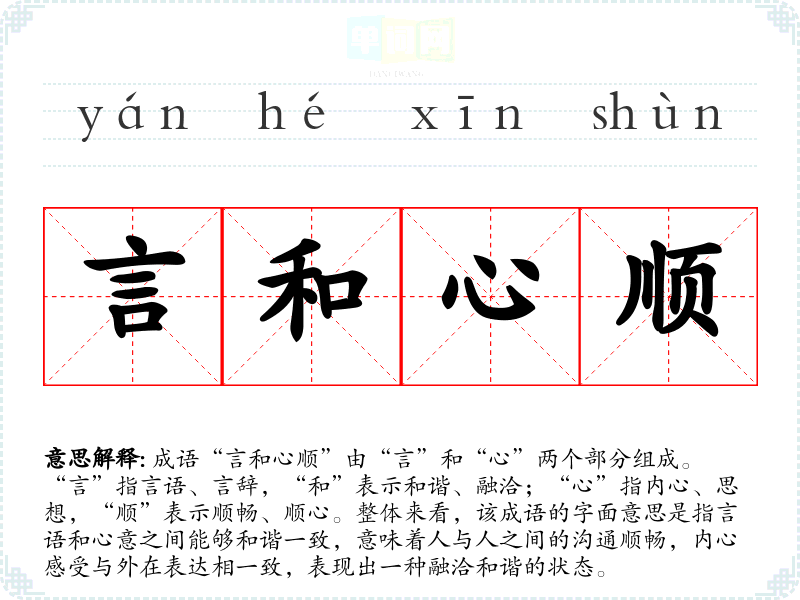 成语“言和心顺”由“言”和“心”两个部分组成。“言”指言语、言辞,“和”表示和谐、融洽;“心”指内心、思想,“顺”表示顺畅、顺心。整体来看,该成语的字面意思是指言语和心意之间能够和谐一致,意味着人与人之间的沟通顺畅,内心感受与外在表达相一致,表现出一种融洽和谐的状态。