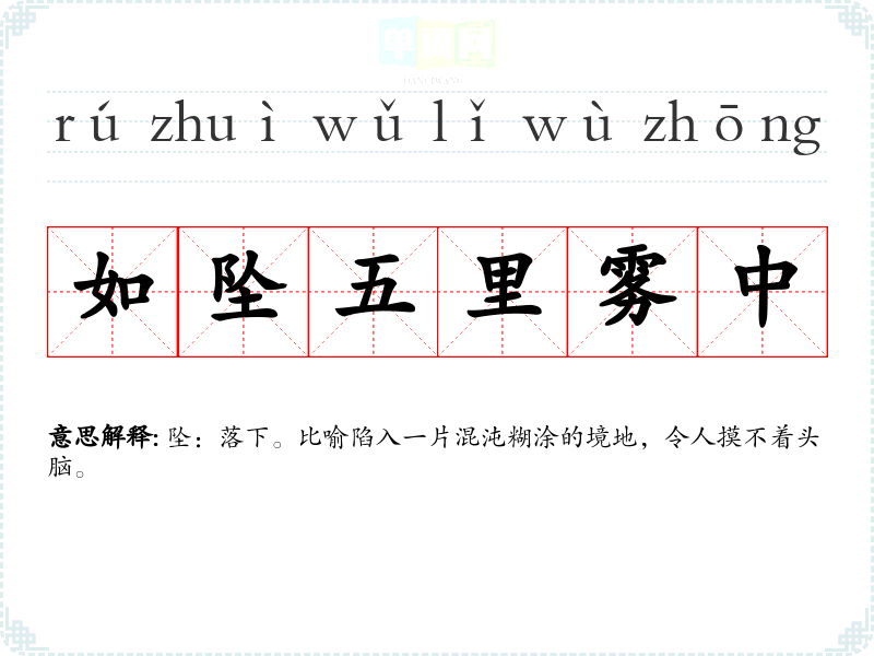 | 五里雾中 | 比喻模糊恍惚、不明真相的境界。 |