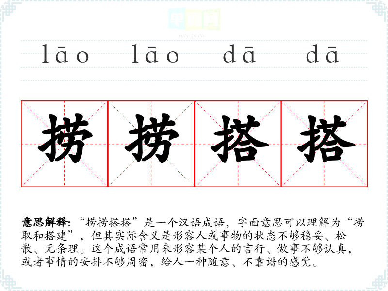 “捞捞搭搭”是一个汉语成语,字面意思可以理解为“捞取和搭建”,但其实际含义是形容人或事物的状态不够稳妥、松散、无条理。这个成语常用来形容某个人的言行、做事不够认真,或者事情的安排不够周密,给人一种随意、不靠谱的感觉。
