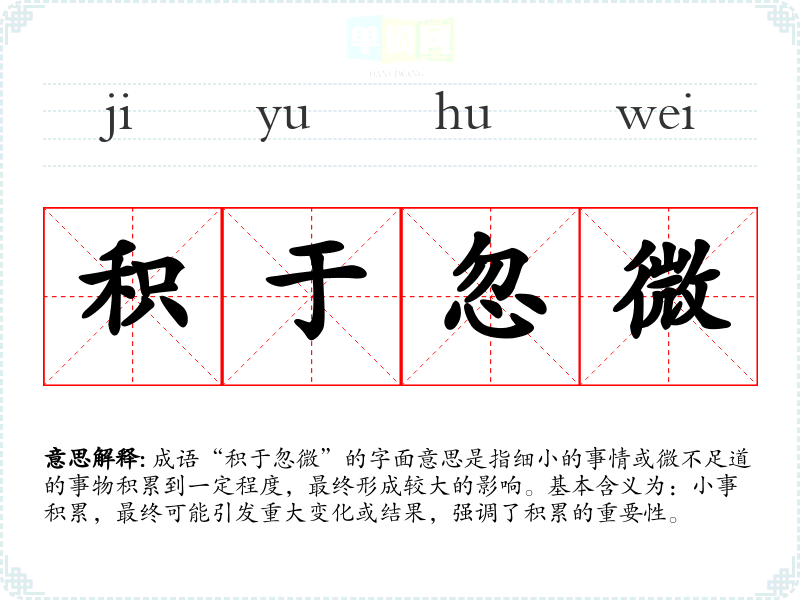 成语“积于忽微”的字面意思是指细小的事情或微不足道的事物积累到一定程度,最终形成较大的影响。基本含义为:小事积累,最终可能引发重大变化或结果,强调了积累的重要性。
