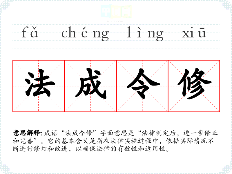 成语“法成令修”字面意思是“法律制定后,进一步修正和完善”。它的基本含义是指在法律实施过程中,依据实际情况不断进行修订和改进,以确保法律的有效性和适用性。