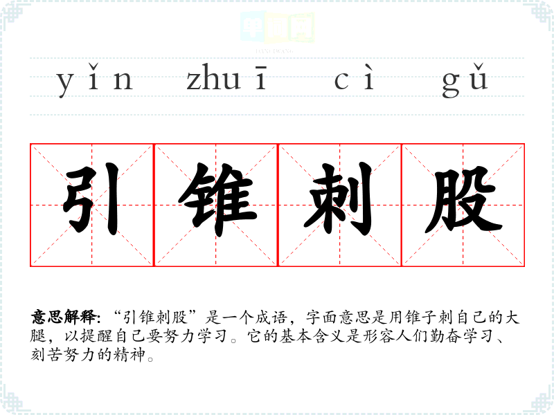 | 引锥刺股 | 锥:锥子;股:大腿。晚间读书时想睡觉,就用锥子刺自己的大腿,以保持清醒。形容学习勤奋刻苦。 |