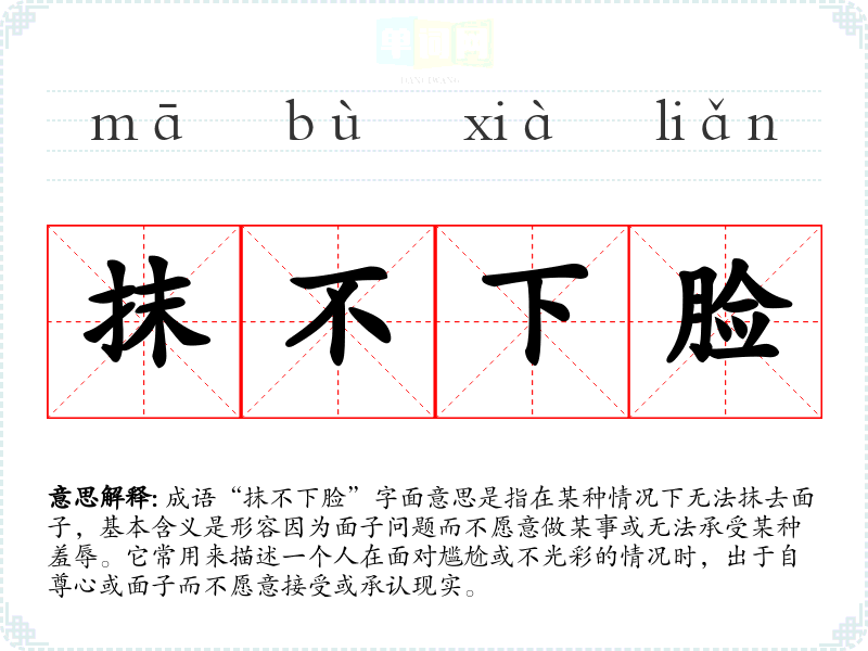 成语“抹不下脸”字面意思是指在某种情况下无法抹去面子,基本含义是形容因为面子问题而不愿意做某事或无法承受某种羞辱。它常用来描述一个人在面对尴尬或不光彩的情况时,出于自尊心或面子而不愿意接受或承认现实。