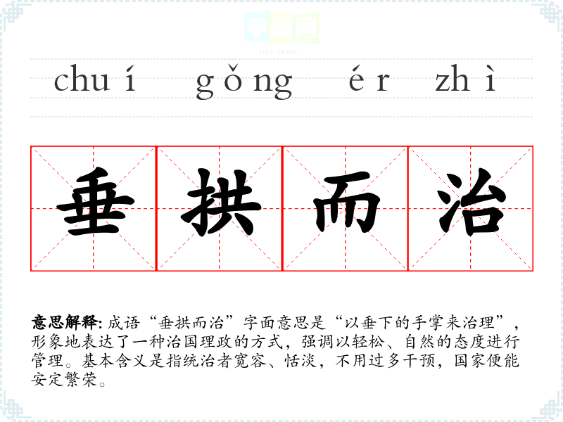 成语“垂拱而治”字面意思是“以垂下的手掌来治理”,形象地表达了一种治国理政的方式,强调以轻松、自然的态度进行管理。基本含义是指统治者宽容、恬淡,不用过多干预,国家便能安定繁荣。