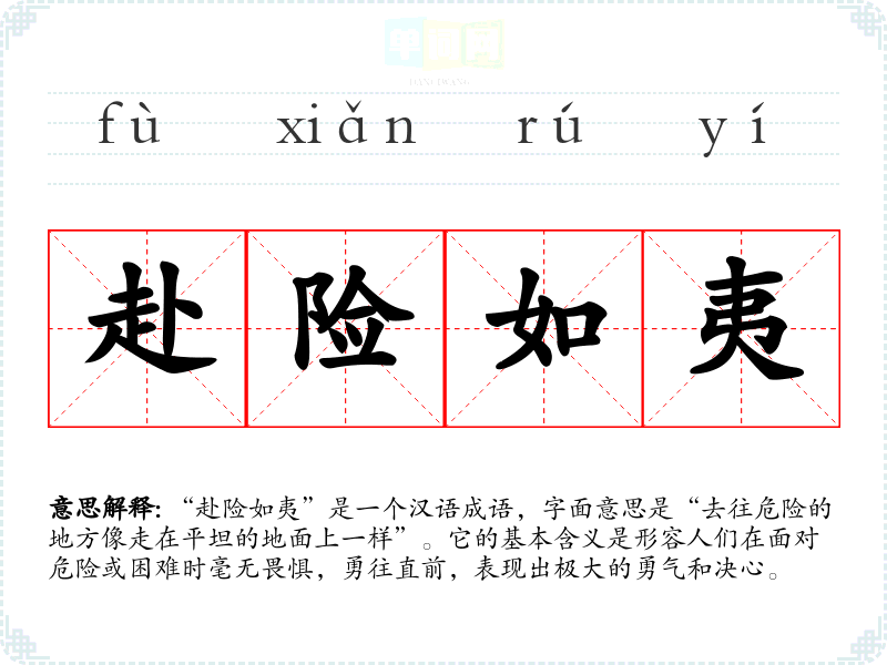 “赴险如夷”是一个汉语成语,字面意思是“去往危险的地方像走在平坦的地面上一样”。它的基本含义是形容人们在面对危险或困难时毫无畏惧,勇往直前,表现出极大的勇气和决心。