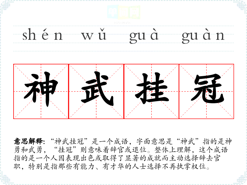 “神武挂冠”是一个成语,字面意思是“神武”指的是神勇和武勇,“挂冠”则意味着辞官或退位。整体上理解,这个成语指的是一个人因表现出色或取得了显著的成就而主动选择辞去官职,特别是指那些有能力、有才华的人士选择不再执掌权位。