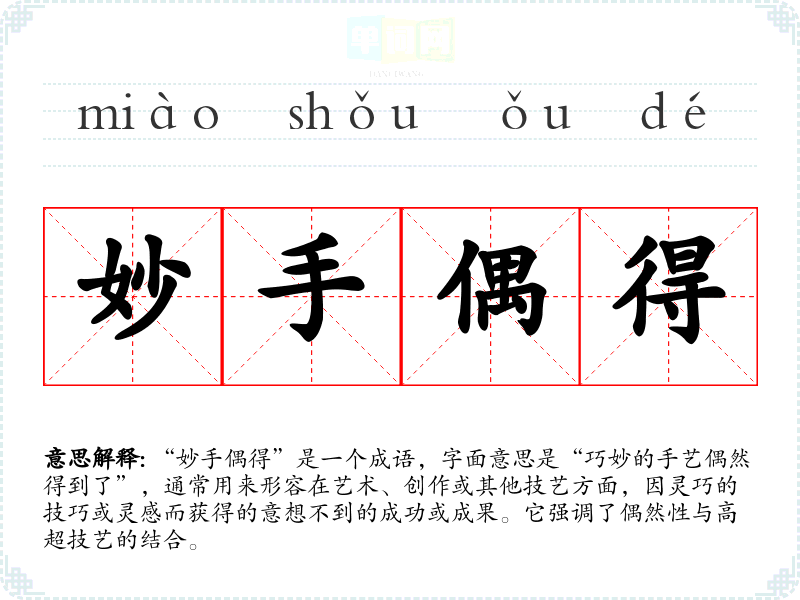 “妙手偶得”是一个成语,字面意思是“巧妙的手艺偶然得到了”,通常用来形容在艺术、创作或其他技艺方面,因灵巧的技巧或灵感而获得的意想不到的成功或成果。它强调了偶然性与高超技艺的结合。
