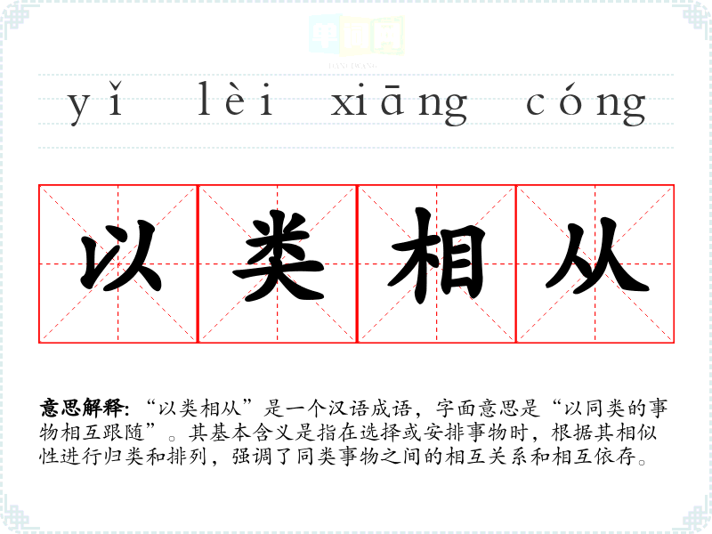 “以类相从”是一个汉语成语,字面意思是“以同类的事物相互跟随”。其基本含义是指在选择或安排事物时,根据其相似性进行归类和排列,强调了同类事物之间的相互关系和相互依存。