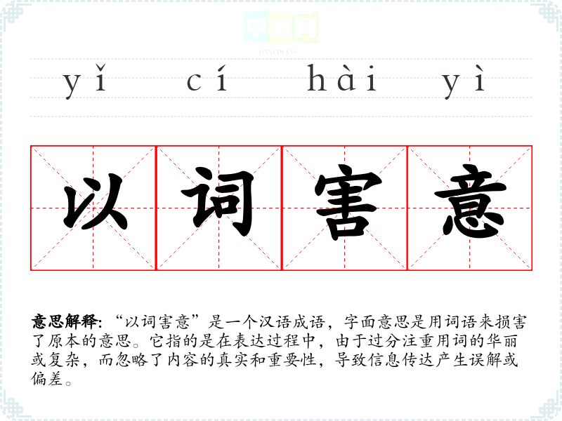 “以词害意”是一个汉语成语,字面意思是用词语来损害了原本的意思。它指的是在表达过程中,由于过分注重用词的华丽或复杂,而忽略了内容的真实和重要性,导致信息传达产生误解或偏差。