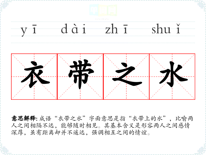 成语“衣带之水”字面意思是指“衣带上的水”,比喻两人之间相隔不远,能够随时相见。其基本含义是形容两人之间感情深厚,虽有距离却并不遥远,强调相互之间的情谊。